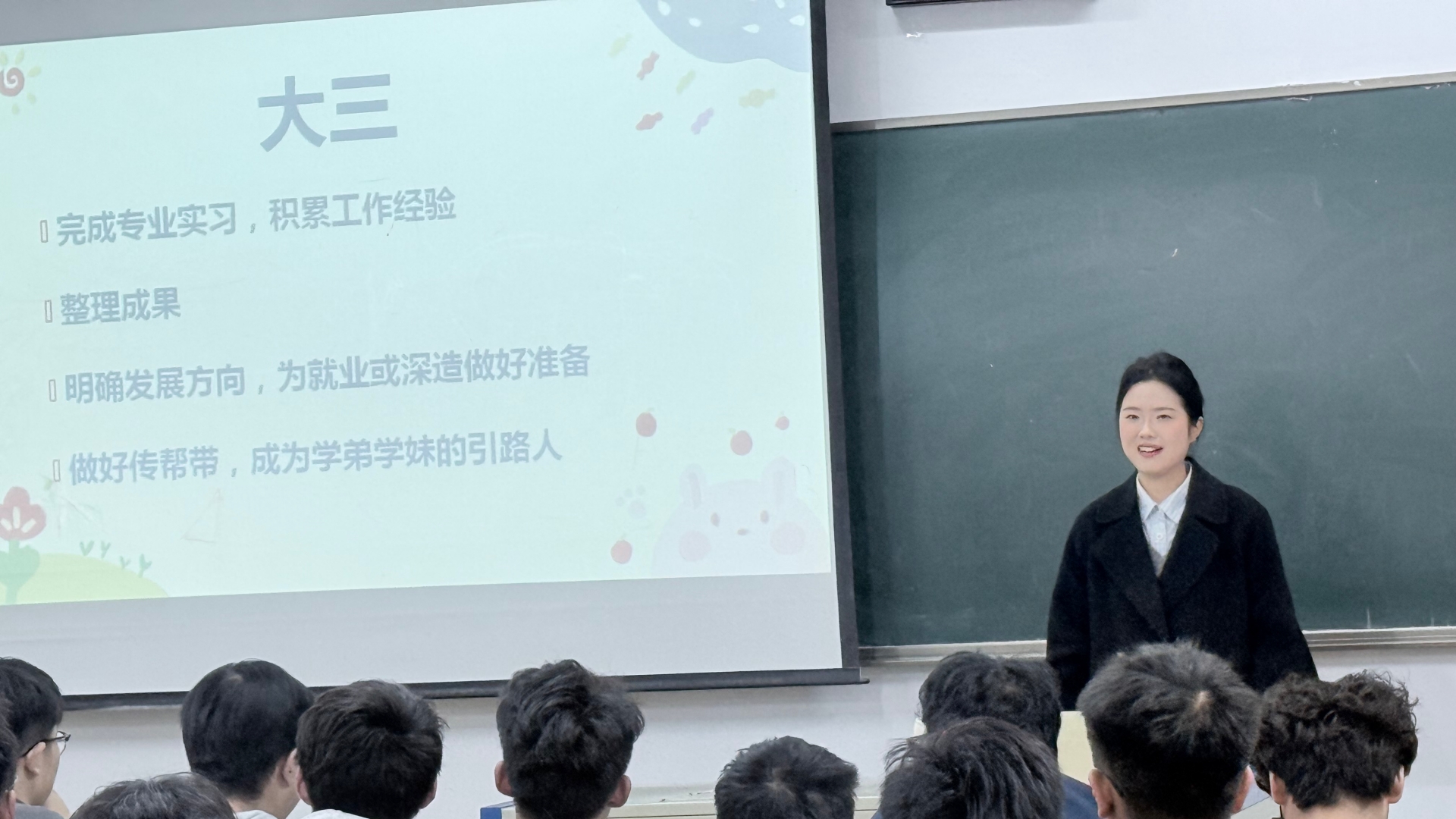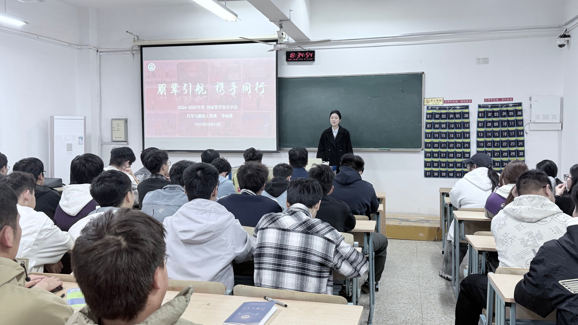 为充分发挥优秀学生的榜样引航作用,10月22日,汽车与机电工程系在9307教室开展“朋辈引航 携手同行”经验分享会。本次分享会邀请汽车与机电工程系2025年国家奖学金提名者李雨欣学姐作经验分享,近百名大一学生代表参加。